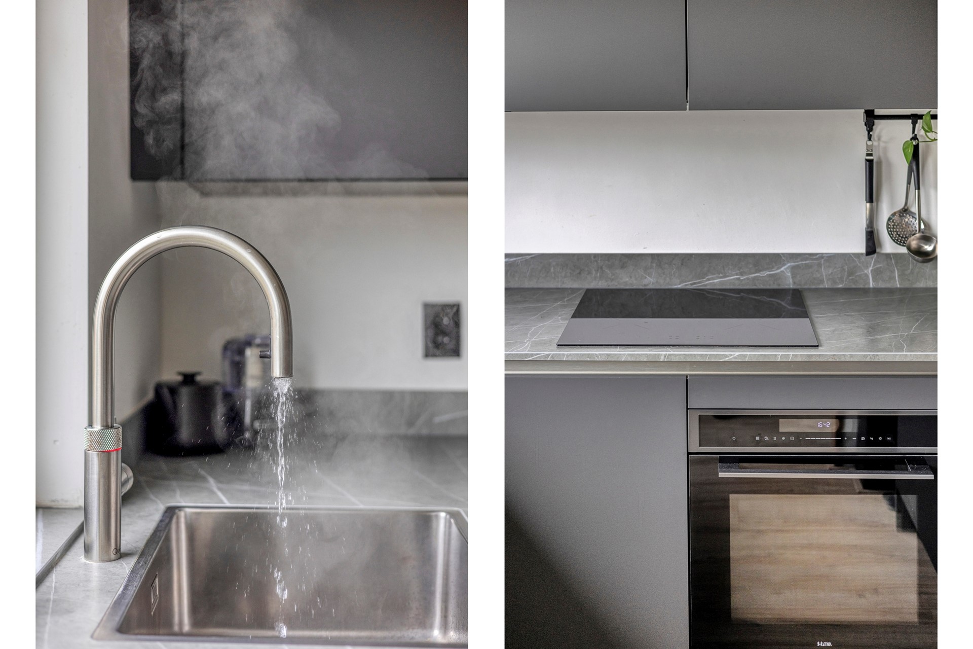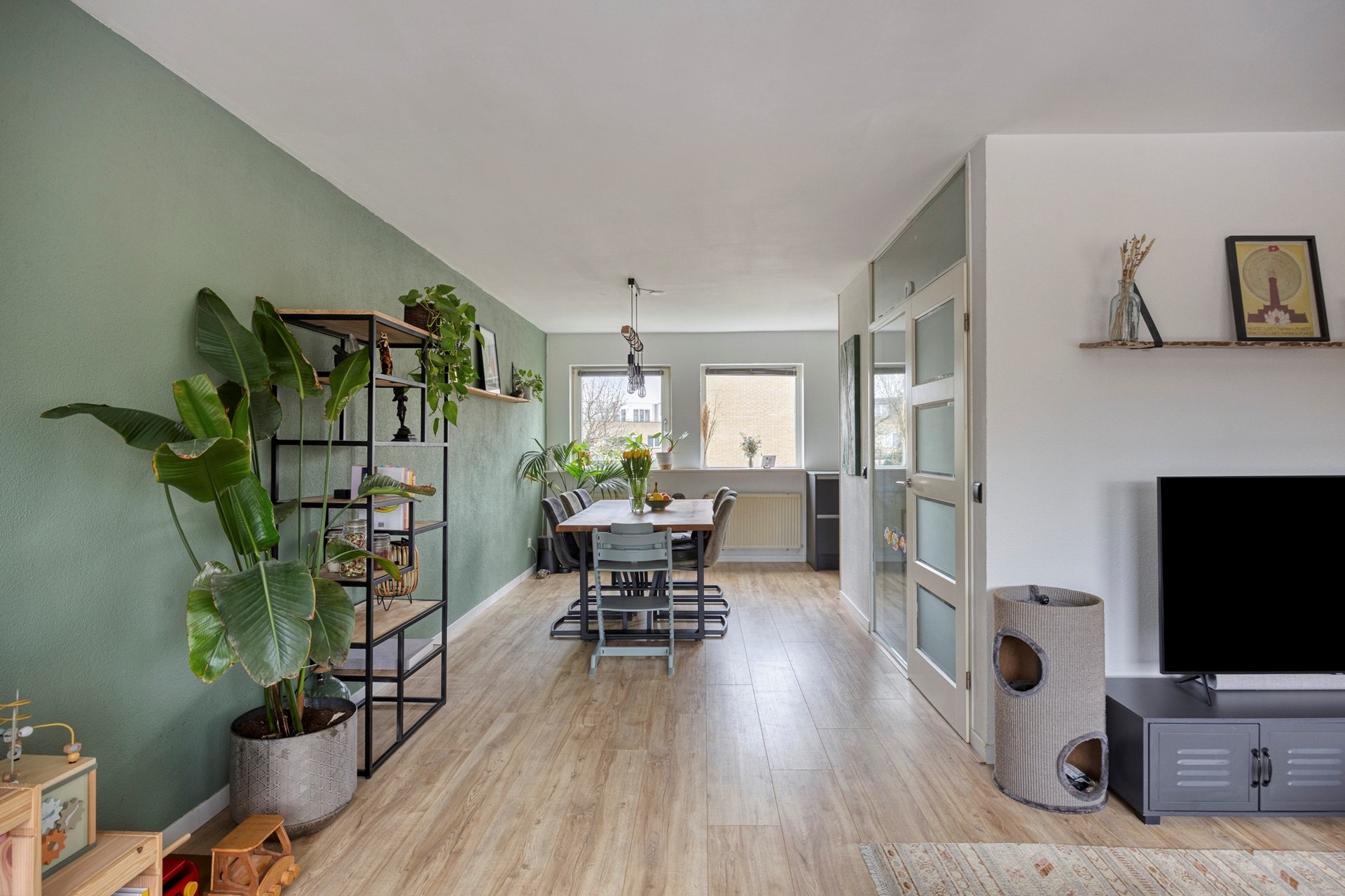 Overloop. Royale lichte L-vormige doorzon woonkamer. Door de vele ramen geniet u aan de voorzijde van de woonkamer van aantrekkelijk uitzicht op o.a. water en groen. Er is genoeg ruimte voor een grote eettafel. Beeldt u zich eens in hoe leuk deze plek in huis kan zijn wanneer u vrienden of familie hebt uitgenodigd voor een diner... De moderne U-vormige open keuken (2022) beschikt o.a. over een keramiek aanrechtblad, inductiekookplaat, combi oven, Quooker, koel/vriescombinatie en een vaatwasser.