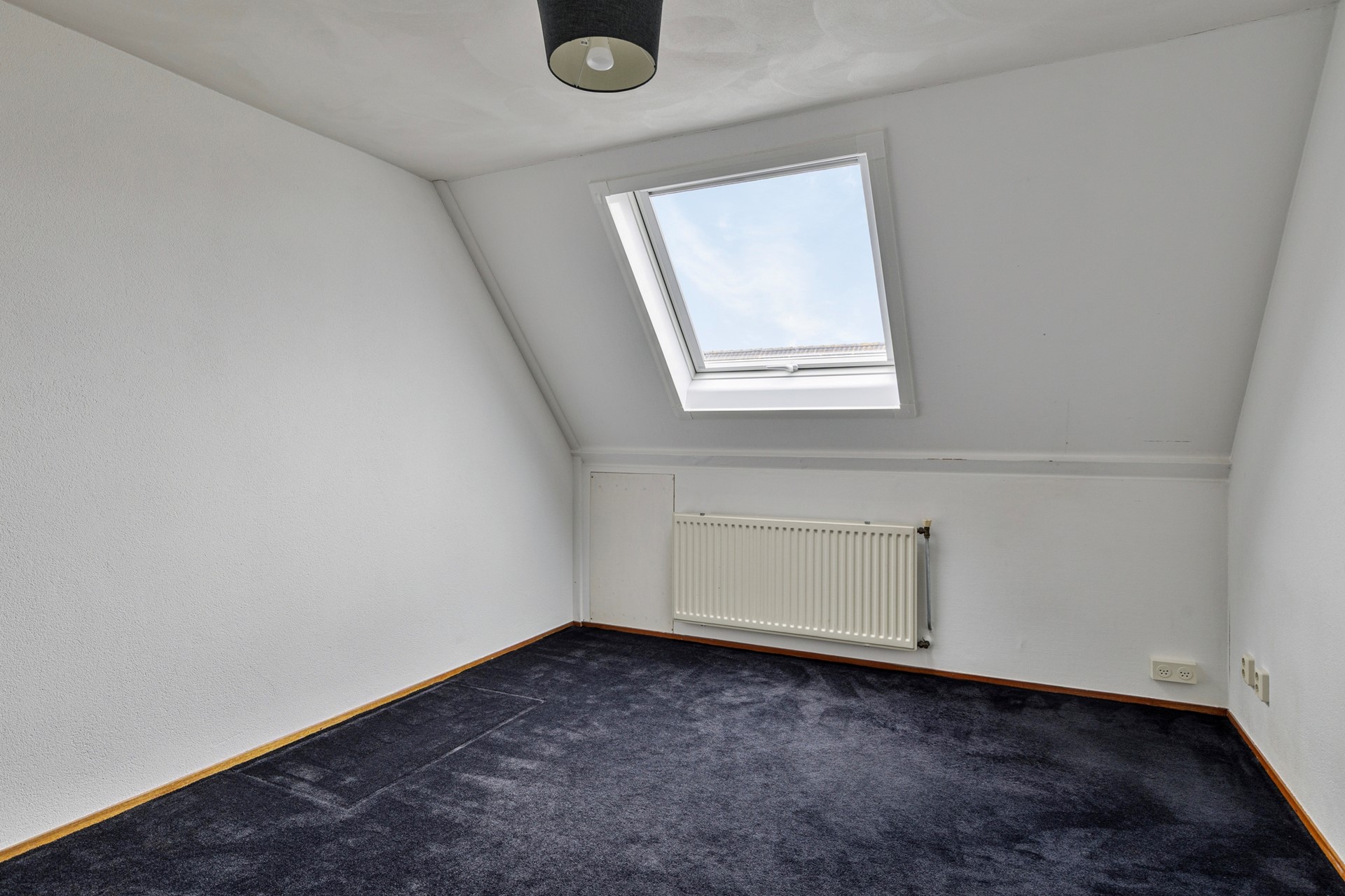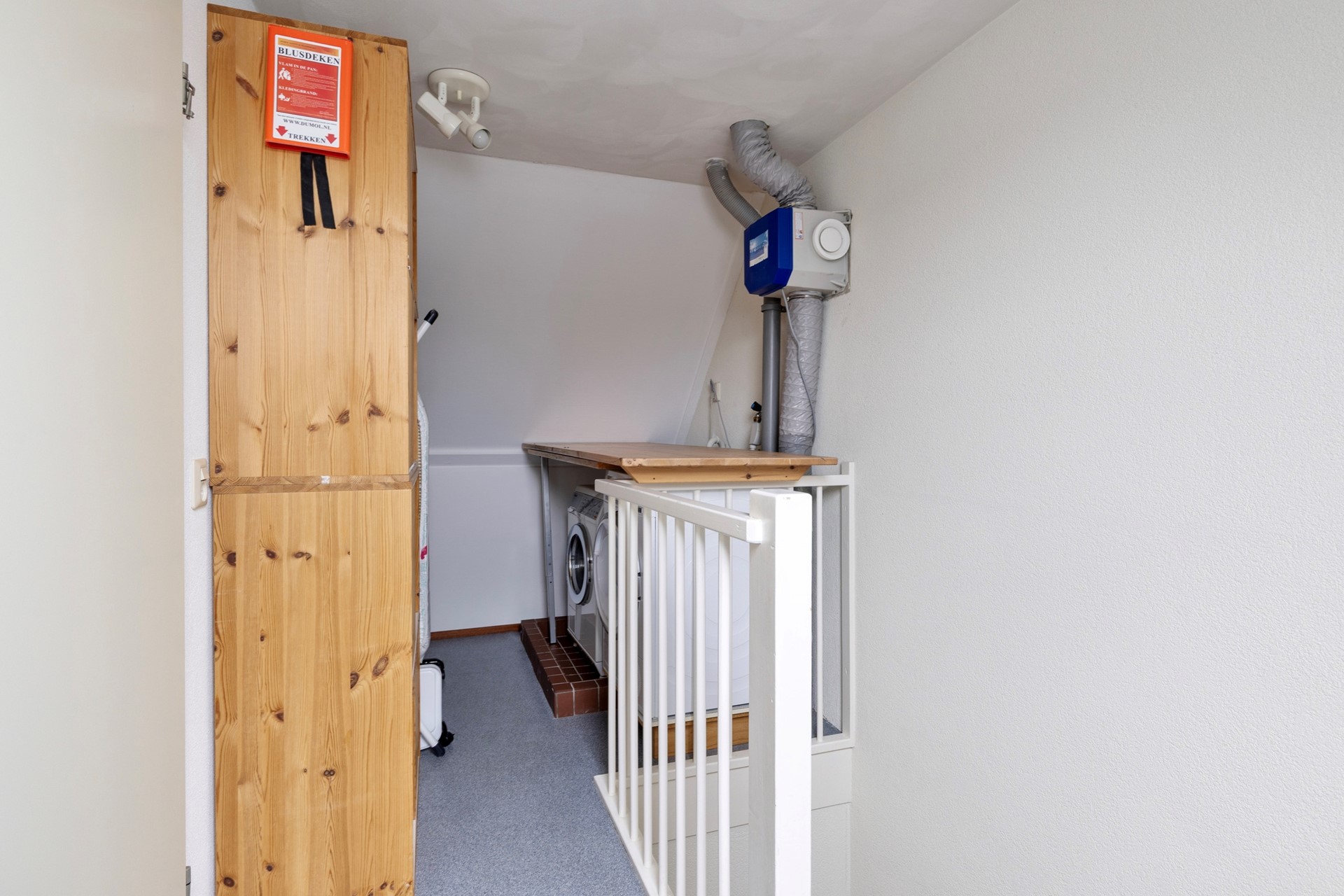 Overloop met dakraam, wasmachineaansluiting en opstelplaats voor de mechanische ventilatie-unit. De ruime zolderslaapkamer met dakraam en radiator is ook uitermate geschikt voor thuiswerkers en/of hobbyisten. Extra opbergruimte vindt u achter de knieschotten en op de vliering.