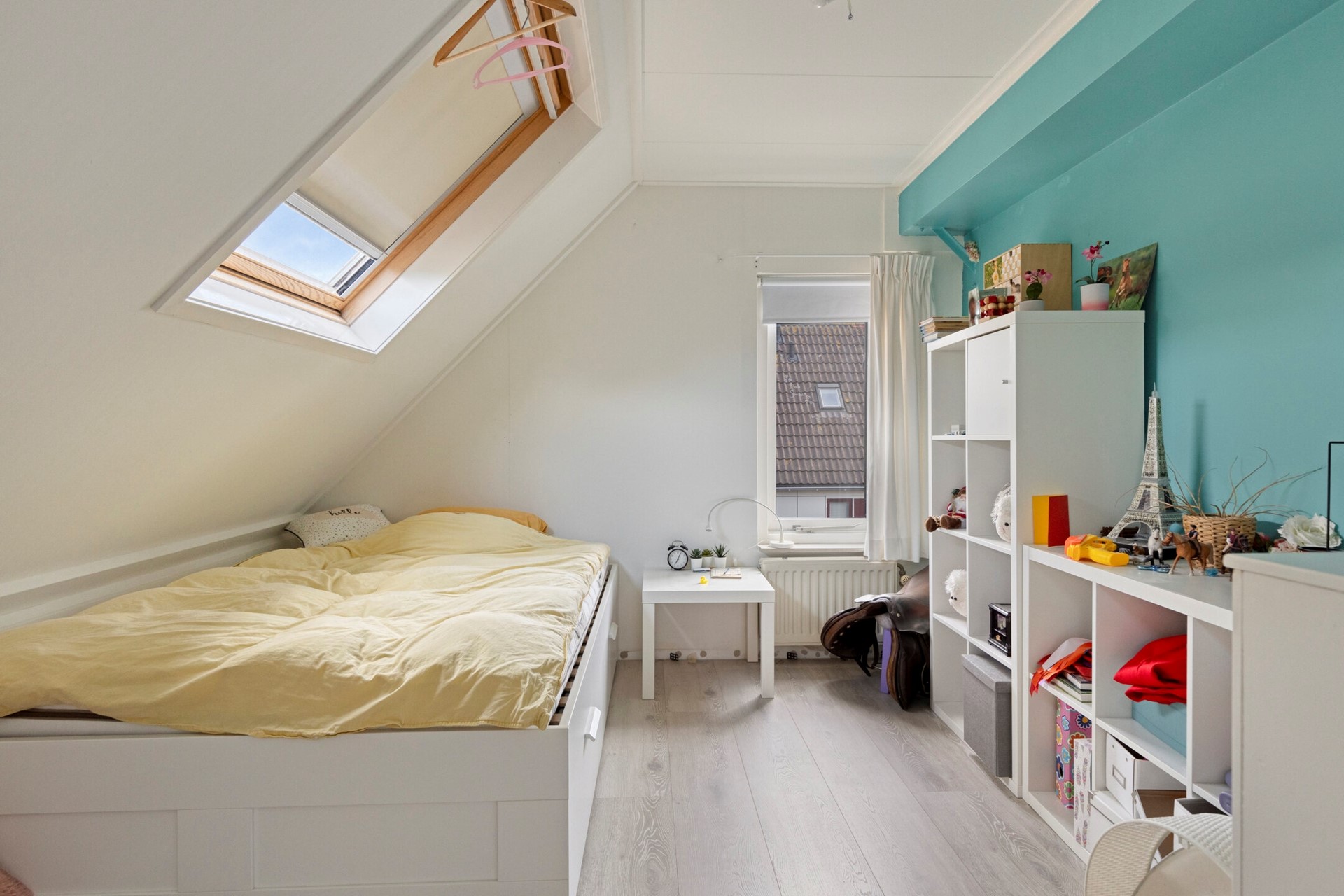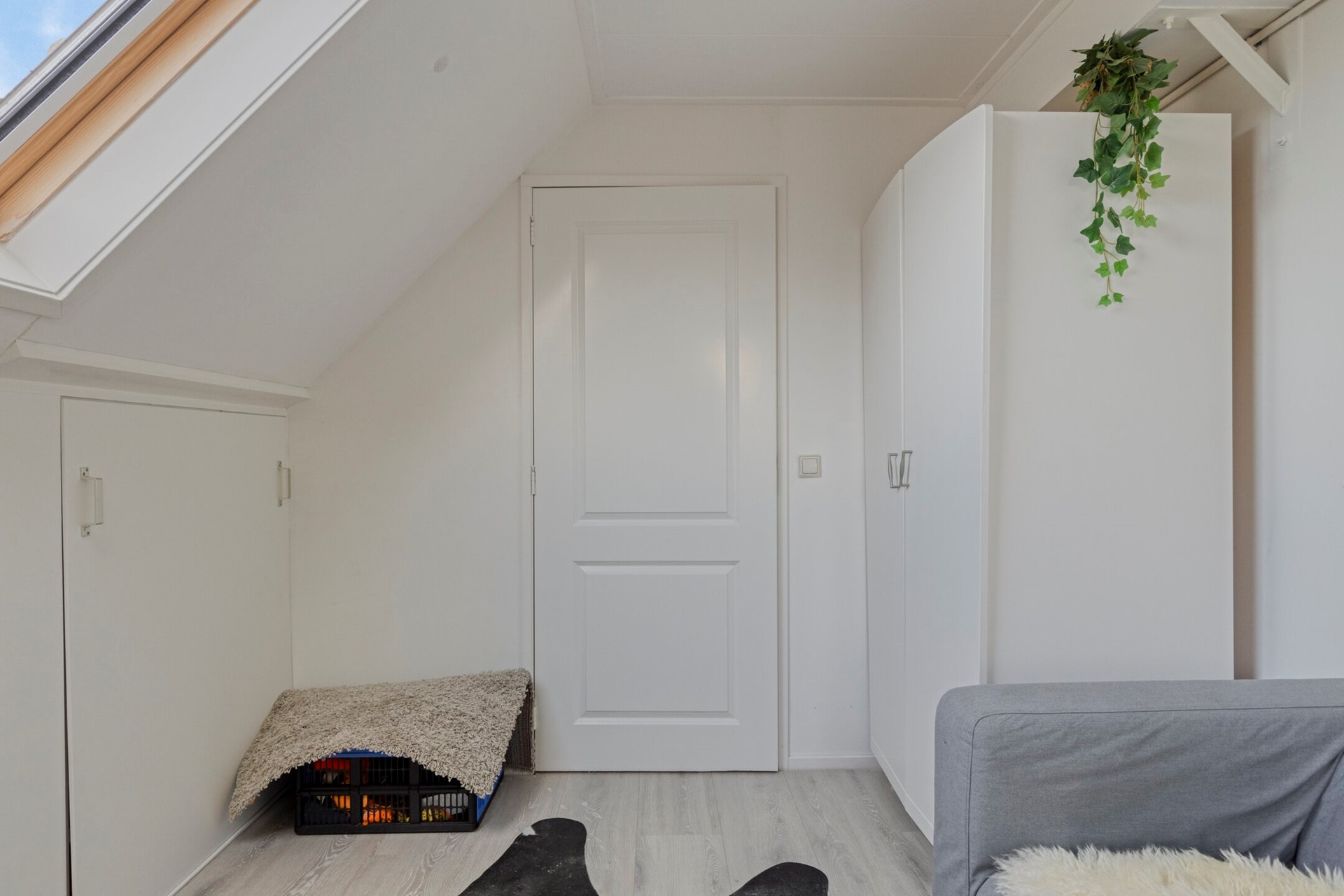 Overloop met dakraam en wasmachineaansluiting. Op deze verdieping bevinden zich nog twee slaapkamers met dakramen. De bergvliering en knieschotten zorgen voor handige opbergruimte.