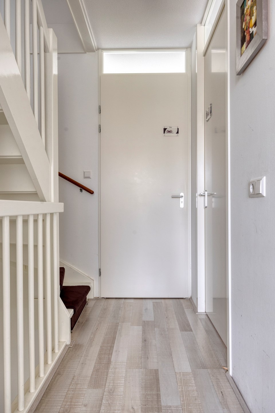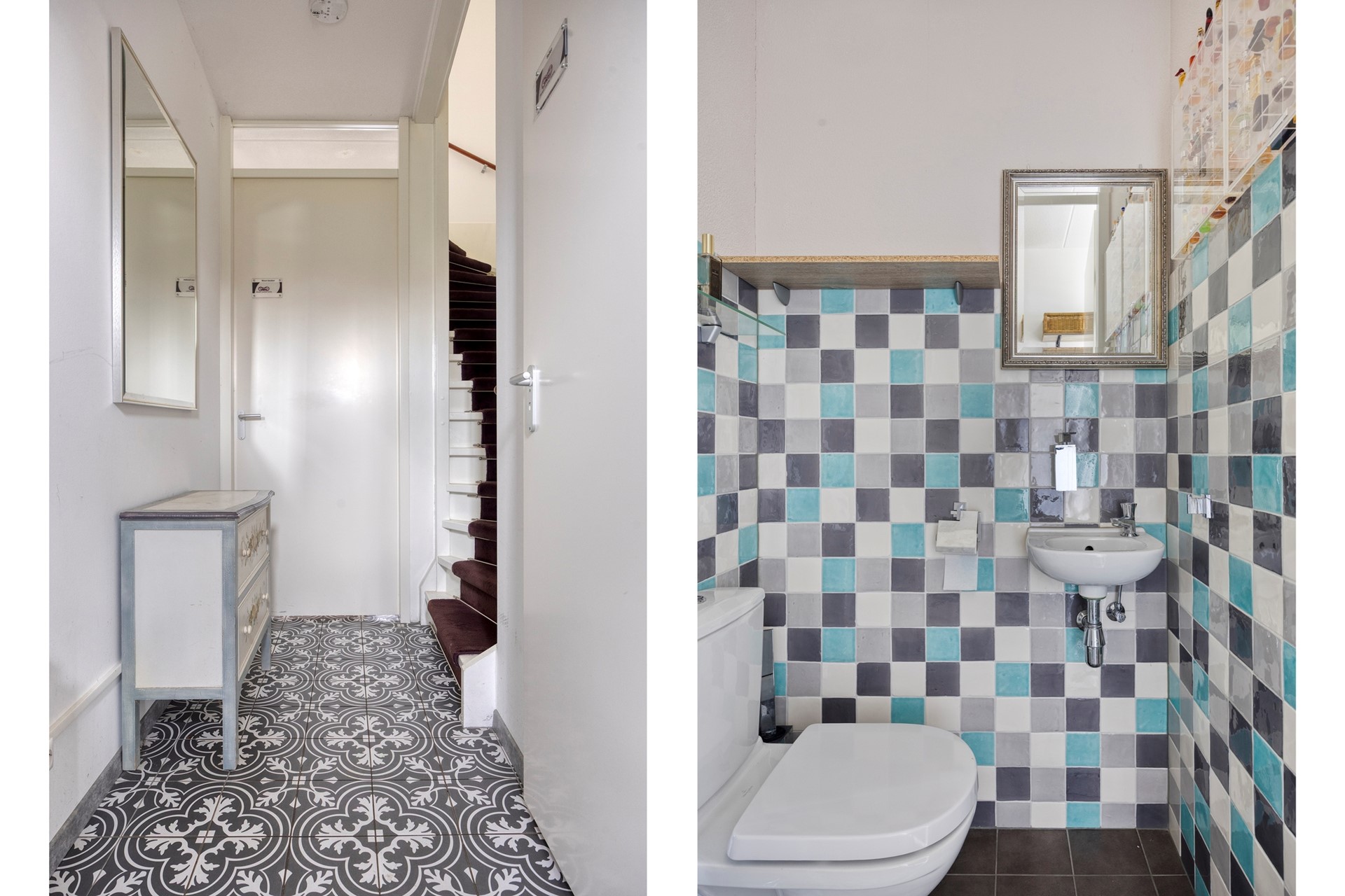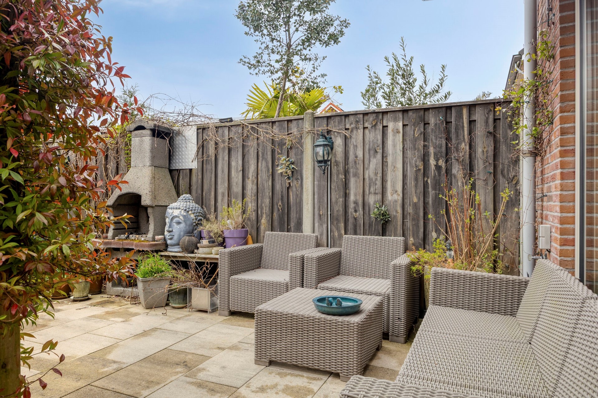 Entree woning, hal met meterkast en een moderne toiletruimte met hangend closet + fonteintje. Royale uitgebouwde keukenruimte voorzien van airconditioning. Er is genoeg ruimte voor een grote eettafel in deze gezellige woonkeuken. Beeldt u zich eens in hoe fijn deze plek in huis kan zijn wanneer u vrienden of familie hebt uitgenodigd voor een diner... De niet alledaagse keuken beschikt o.a. over een kookeiland met granieten werkblad, 6-pitskookplaat, rvs afzuigkap, vaatwasser en een eetbar. Aan de lange zijde bevindt zich een kastenwand met houten werkblad, koelkast, vriezer, combi magnetron en een combi oven. Handige opbergruimte vindt u in de trapkast. Door de grote raampartij geniet u van optimaal uitzicht op de achtertuin. Aan de voorzijde van de woning vindt u de intieme living. De hal, living en woonkeuken zijn afgewerkt met een Portugese tegelvloer die zorgt voor een karakteristieke, warme en mediterrane uitstraling. Zonliefhebbers opgelet! Via de schuifpui in de woonkamer bereikt u de heerlijk zonnige achtertuin gelegen op het zuidwesten. Het elektrisch bedienbare zonnescherm, de terrasverwarmer, de houten berging en de achterom zorgen voor comfort. De houten pergola met harmonica schaduwdoek geeft structuur en sfeer aan deze aantrekkelijke tuin. Uw eigen parkeerplaats bevindt zich op het achtergelegen terrein.