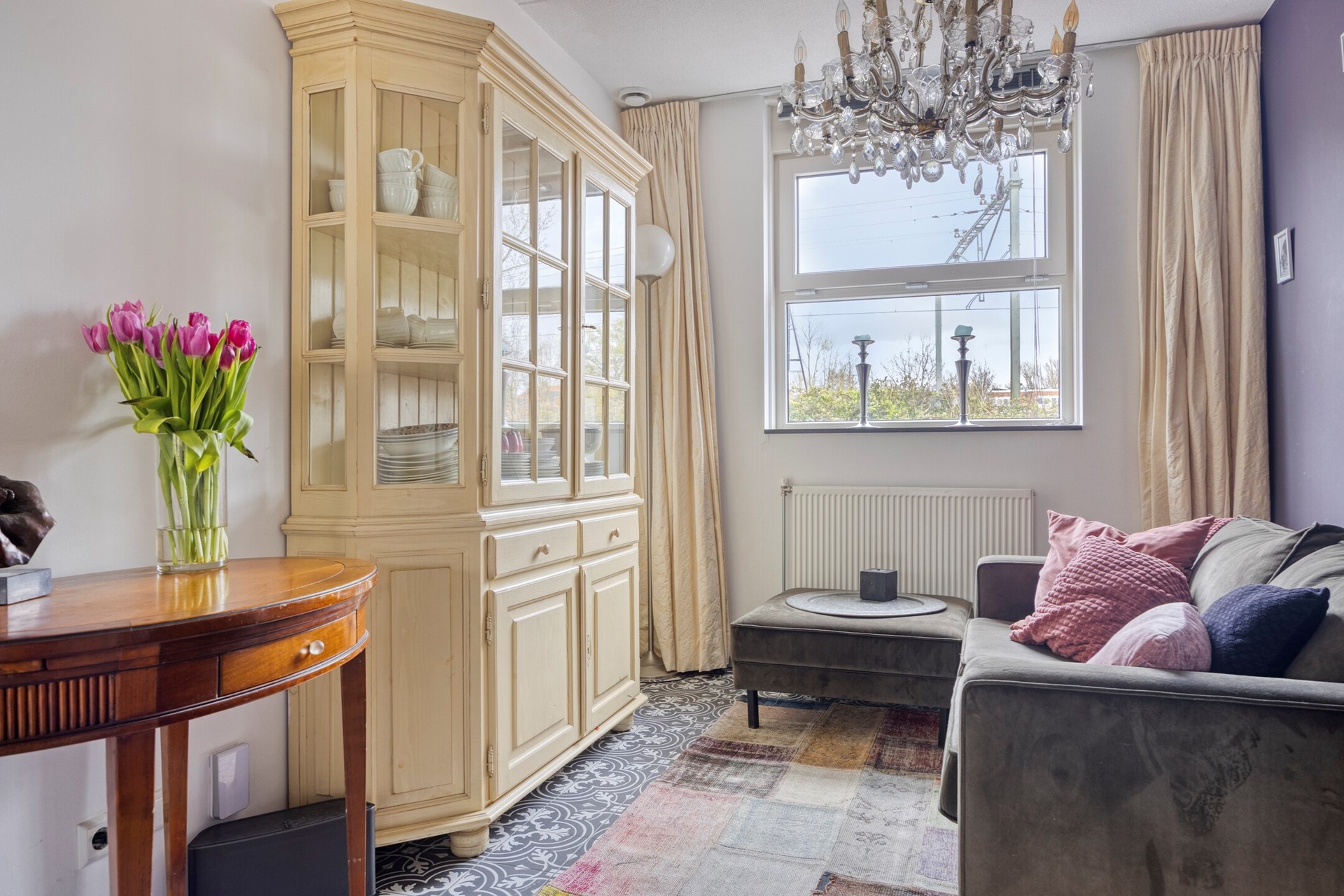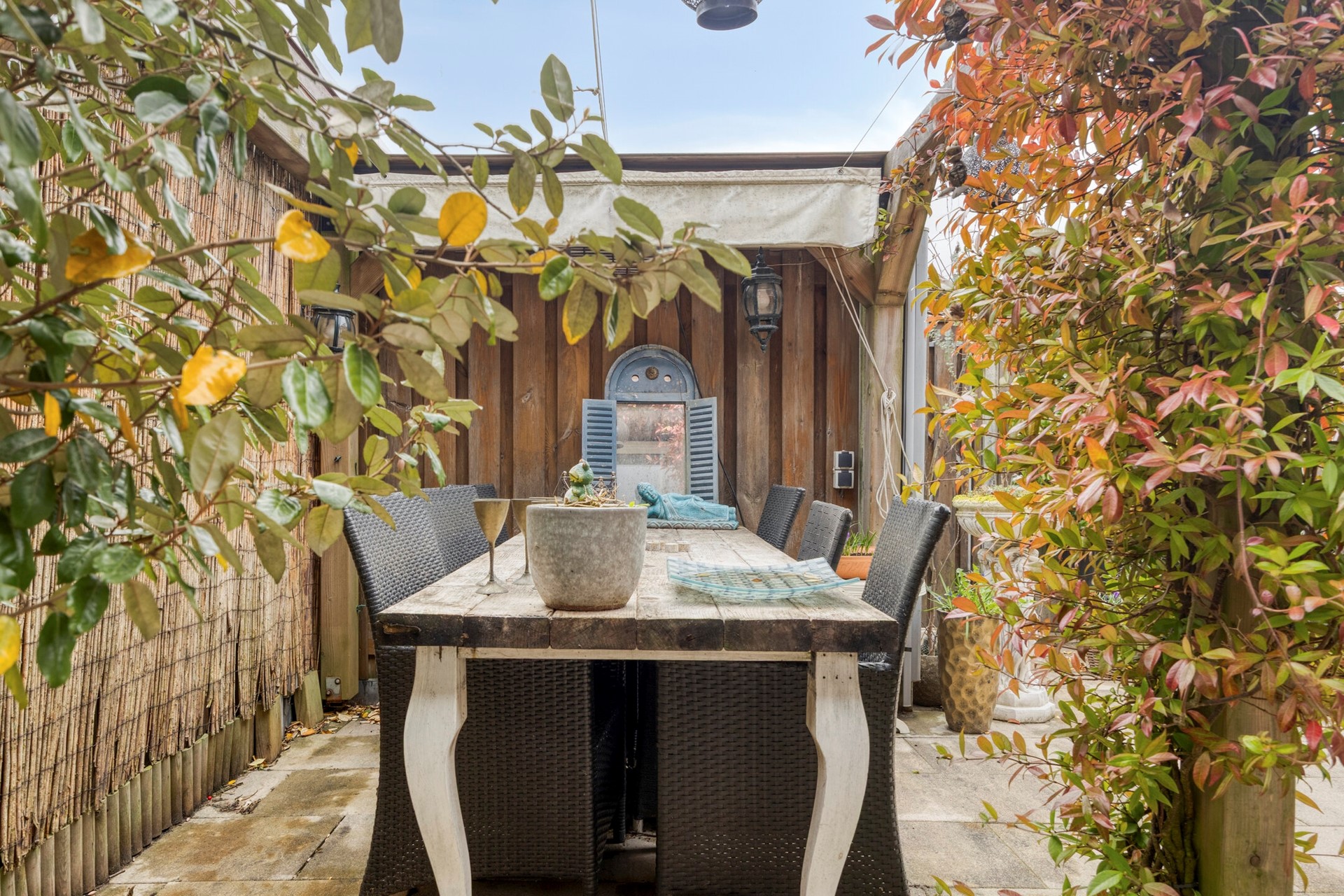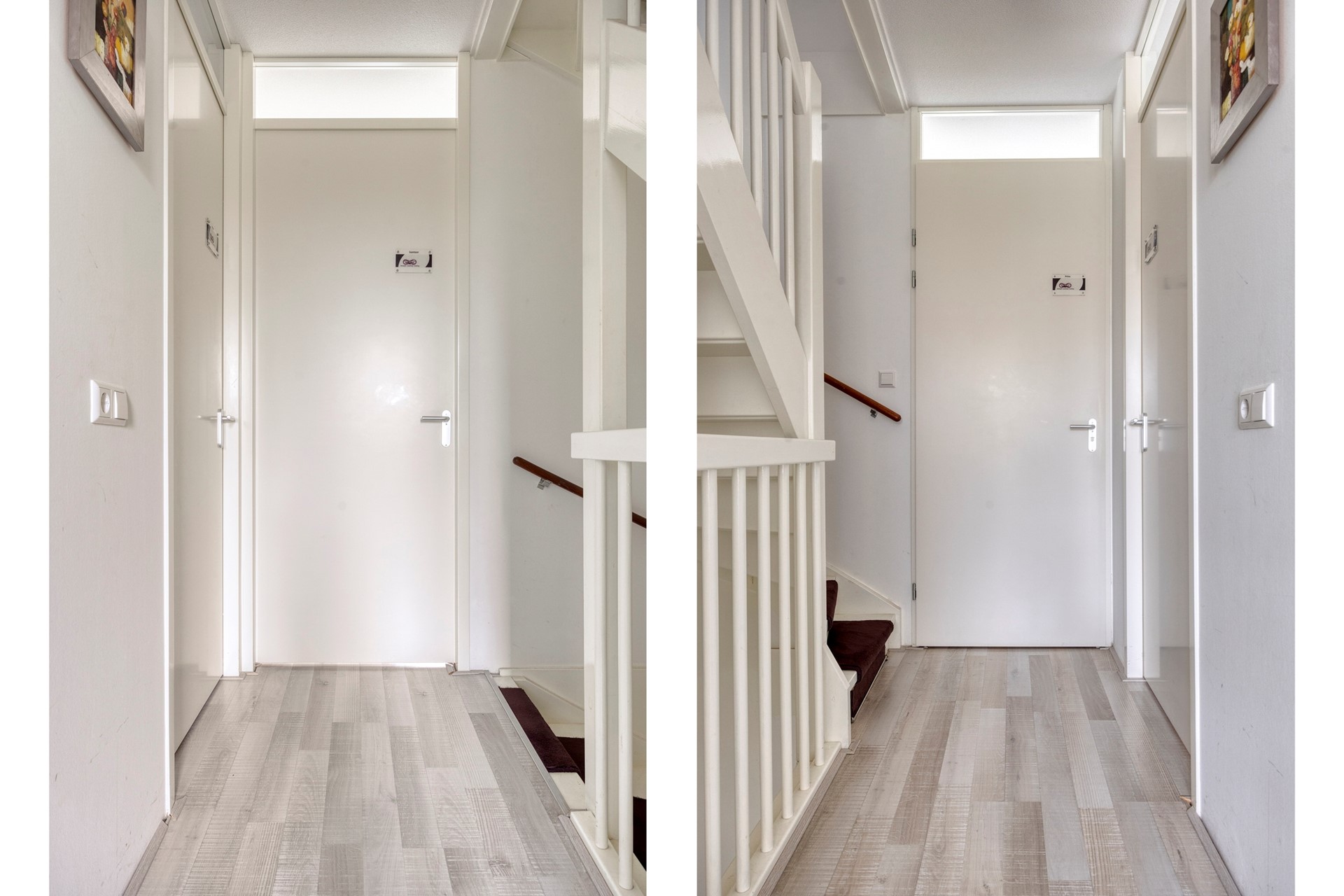Entree woning, hal met meterkast en een moderne toiletruimte met hangend closet + fonteintje. Royale uitgebouwde keukenruimte voorzien van airconditioning. Er is genoeg ruimte voor een grote eettafel in deze gezellige woonkeuken. Beeldt u zich eens in hoe fijn deze plek in huis kan zijn wanneer u vrienden of familie hebt uitgenodigd voor een diner... De niet alledaagse keuken beschikt o.a. over een kookeiland met granieten werkblad, 6-pitskookplaat, rvs afzuigkap, vaatwasser en een eetbar. Aan de lange zijde bevindt zich een kastenwand met houten werkblad, koelkast, vriezer, combi magnetron en een combi oven. Handige opbergruimte vindt u in de trapkast. Door de grote raampartij geniet u van optimaal uitzicht op de achtertuin. Aan de voorzijde van de woning vindt u de intieme living. De hal, living en woonkeuken zijn afgewerkt met een Portugese tegelvloer die zorgt voor een karakteristieke, warme en mediterrane uitstraling. Zonliefhebbers opgelet! Via de schuifpui in de woonkamer bereikt u de heerlijk zonnige achtertuin gelegen op het zuidwesten. Het elektrisch bedienbare zonnescherm, de terrasverwarmer, de houten berging en de achterom zorgen voor comfort. De houten pergola met harmonica schaduwdoek geeft structuur en sfeer aan deze aantrekkelijke tuin. Uw eigen parkeerplaats bevindt zich op het achtergelegen terrein.