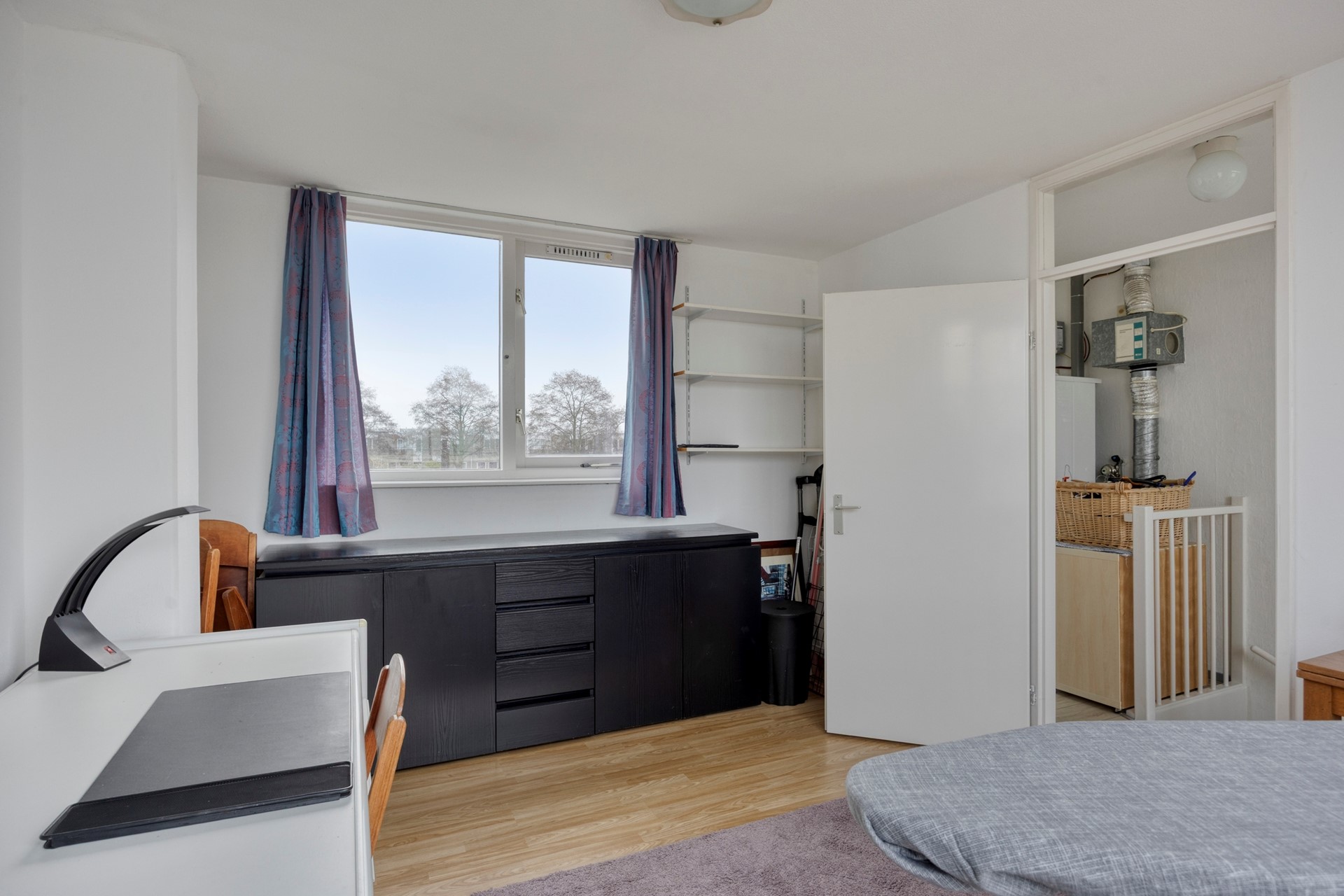 Overloop met wasmachineaansluiting, omvormer voor de zonnepanelen, opstelplaats voor de mechanische ventilatie-unit en de toegang tot het dakterras (NW). Thuiswerkers en hobbyisten opgelet! De ruime zolder(slaap)kamer is ook uitermate geschikt als (thuis)werk- en/of hobbyruimte.