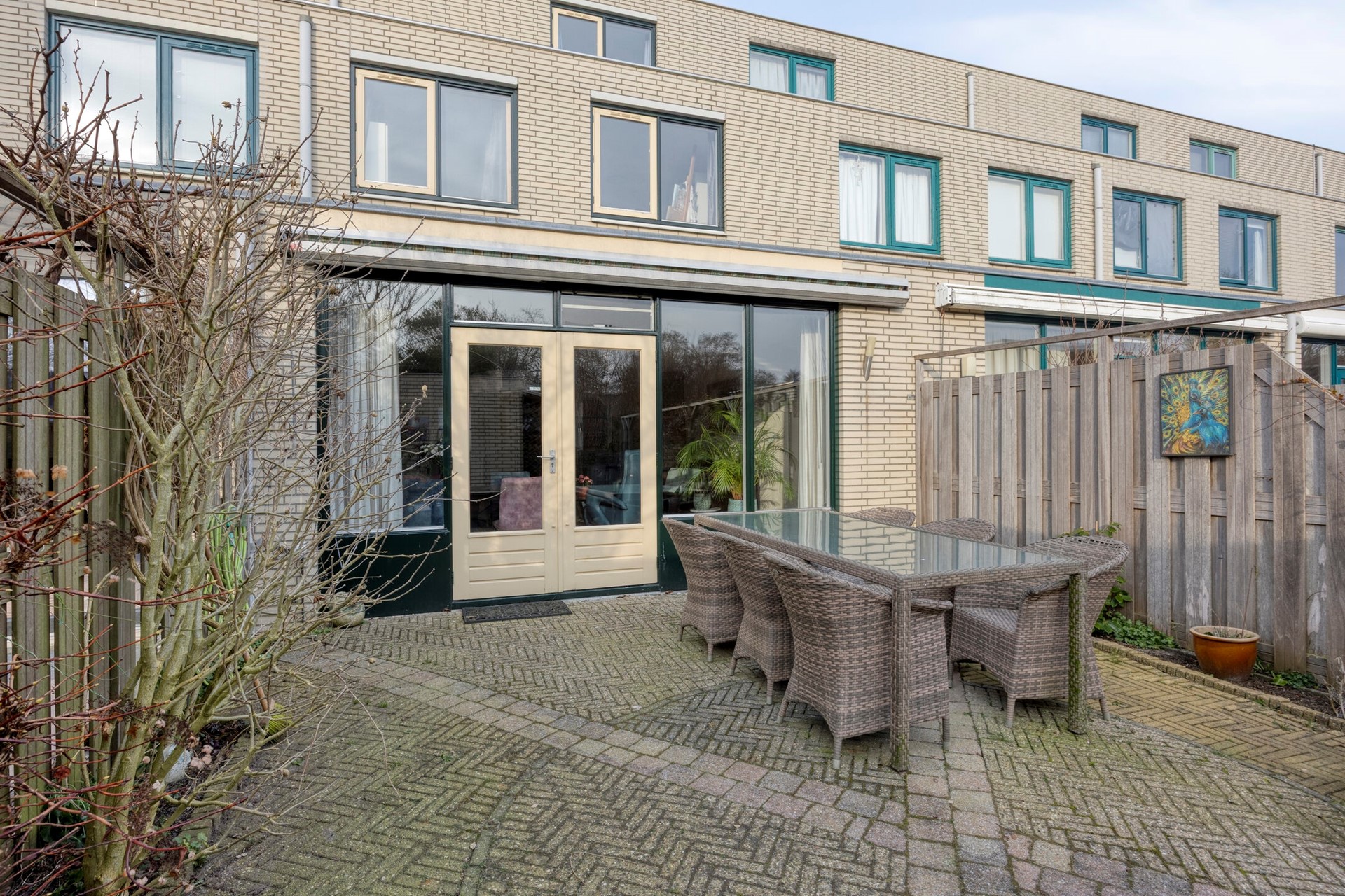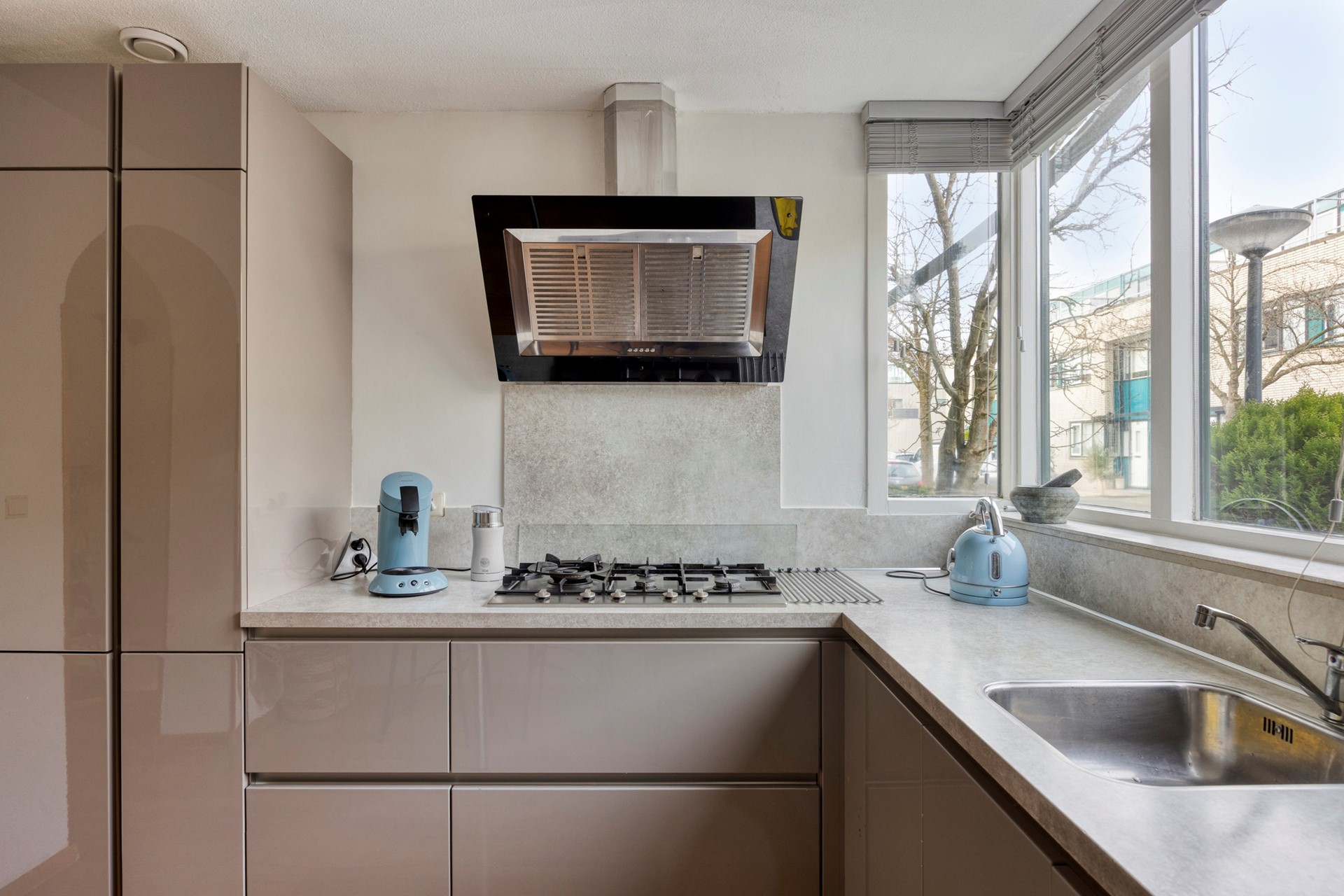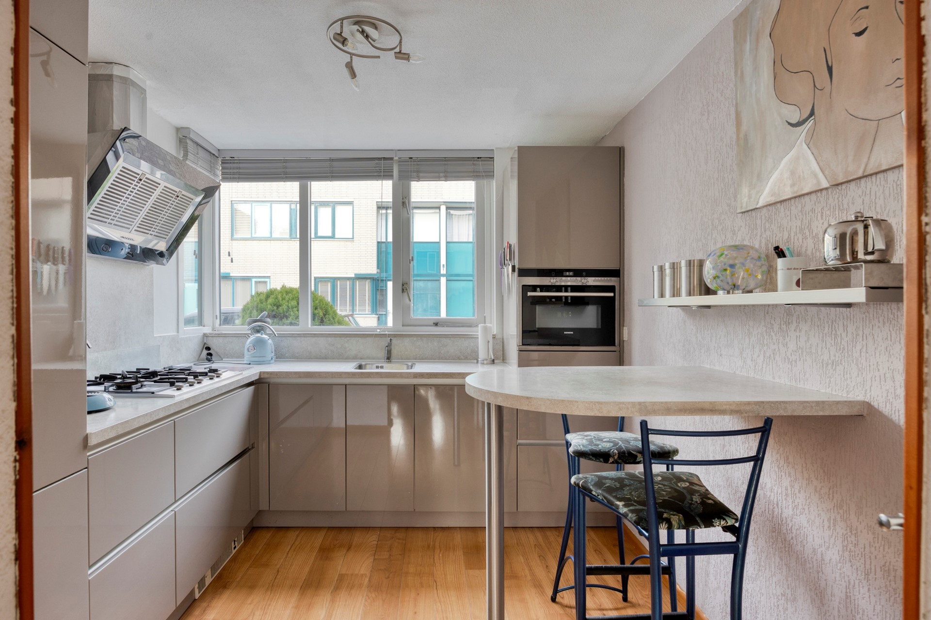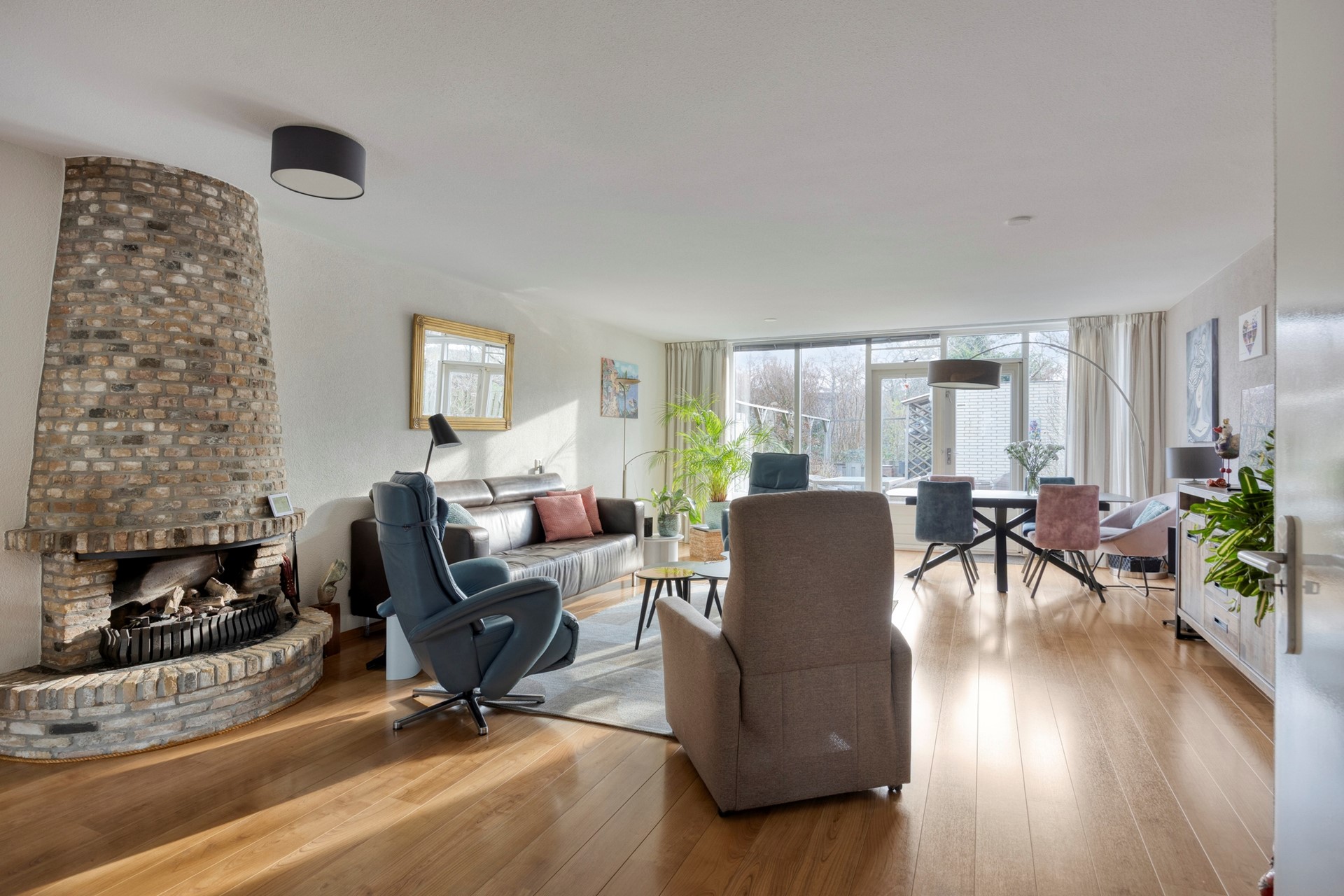 Entree woning. Hal met meterkast/stadsverwarming en een moderne toiletruimte met hangend closet + fonteintje (2022). De ruime uitgebouwde woonkamer maakt deze woning extra bezichtigingswaardig. Door de gashaard geniet u het gehele jaar door van een sfeervol vuurtje. Er is genoeg ruimte voor een grote eettafel. Beeldt u zich eens in hoe fijn deze plek in huis kan zijn wanneer u vrienden of familie hebt uitgenodigd voor een diner... De verzorgde open keuken is gelegen aan de voorzijde van de woning en is o.a. voorzien van een 5-pitskookplaat, rvs afzuigkap, handige apothekerskast, koel/vriescombinatie, combi oven, vaatwasser en een bartafel met twee barkrukken. De trapkast zorgt voor opbergruimte. De achterpui van de begane grond is voorzien van dubbele openslaande deuren. Door de grote raampartij geniet u van een lichte woonkamer met optimaal uitzicht op de achtertuin. De zonnige achtertuin is gelegen op het zuidoosten en beschikt o.a. over een zonnescherm, stenen berging en een achterom. Kenmerkend voor deze aantrekkelijke tuin is de vrije ligging waardoor u veel privacy geniet.