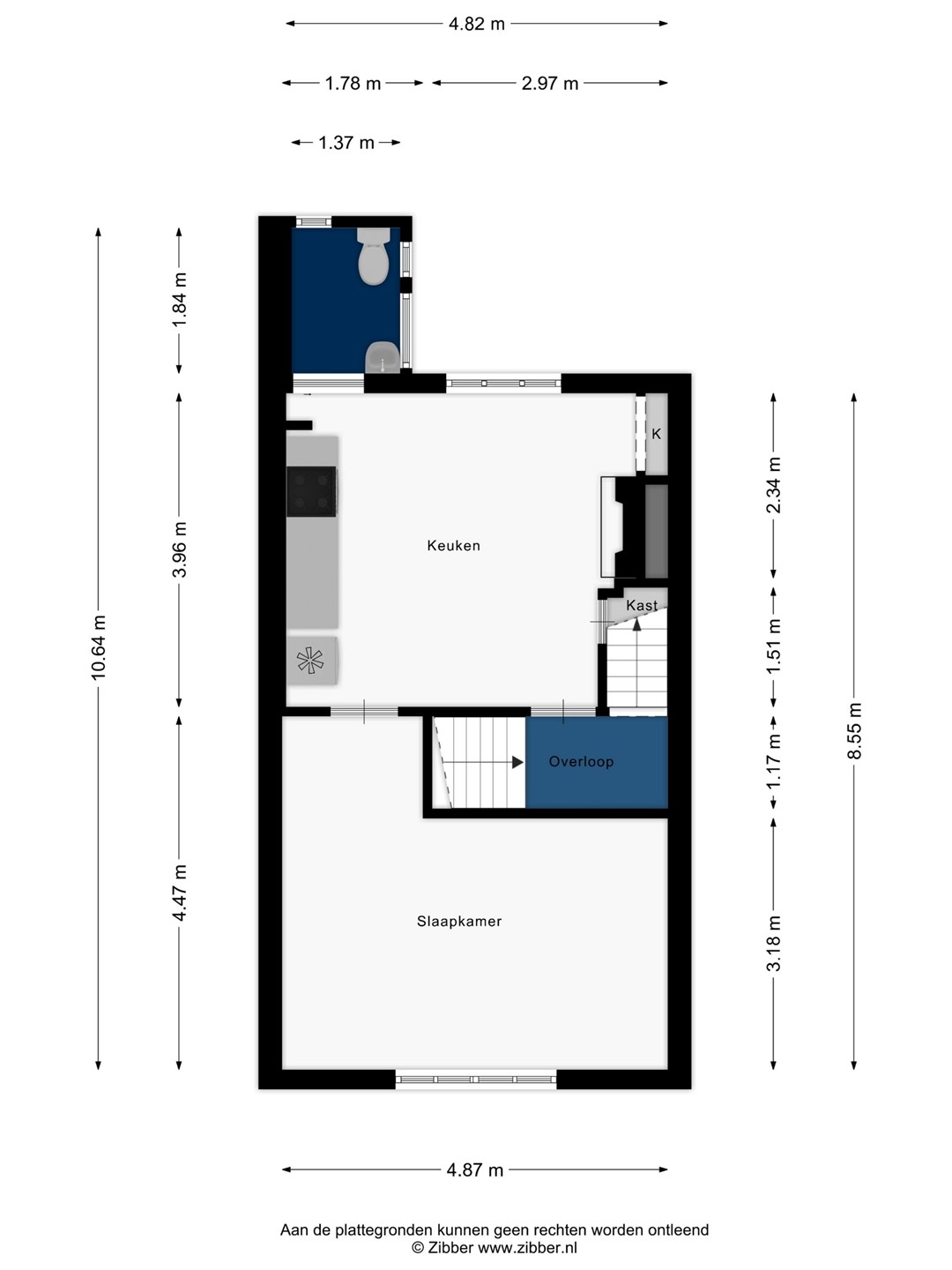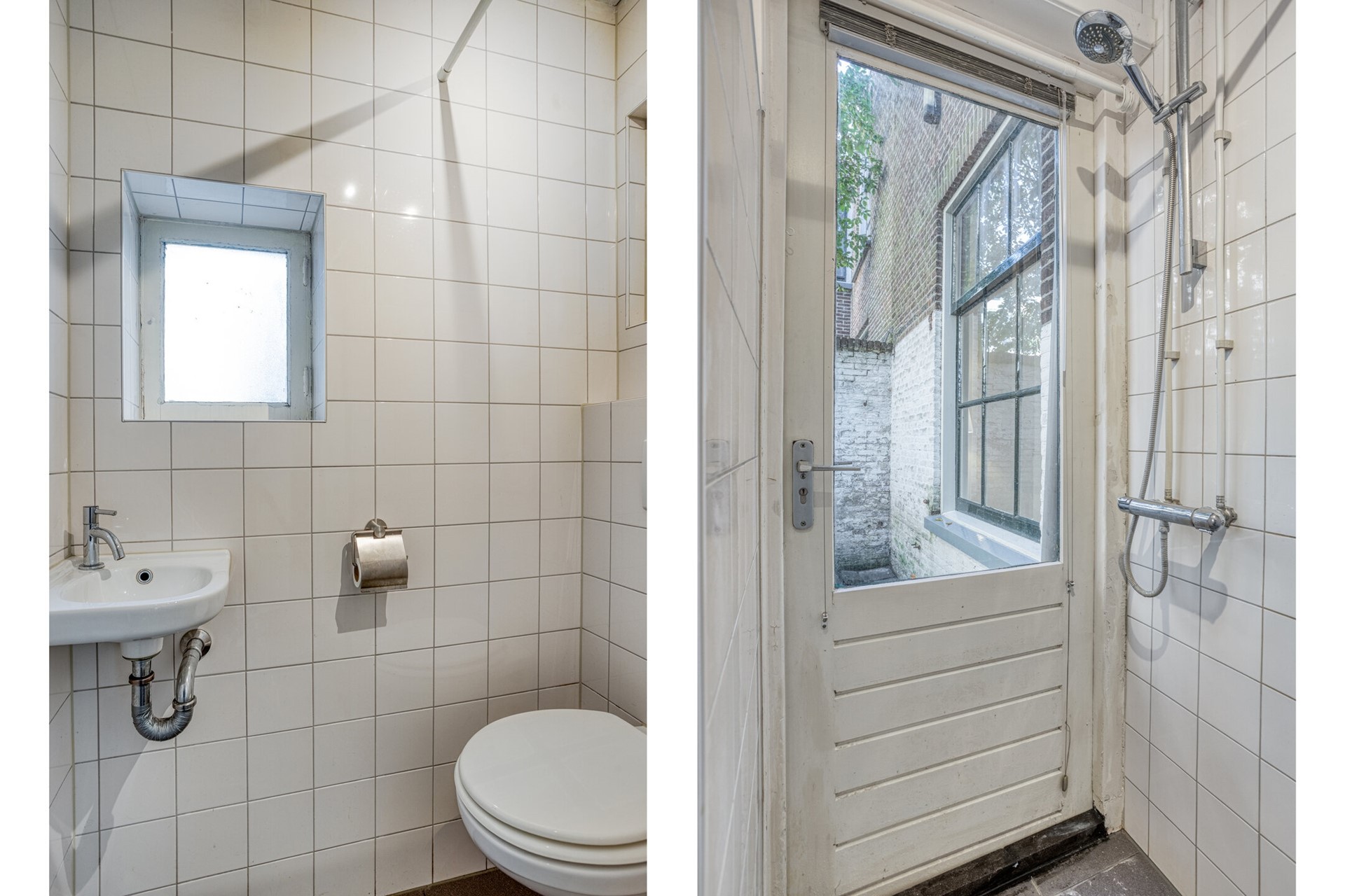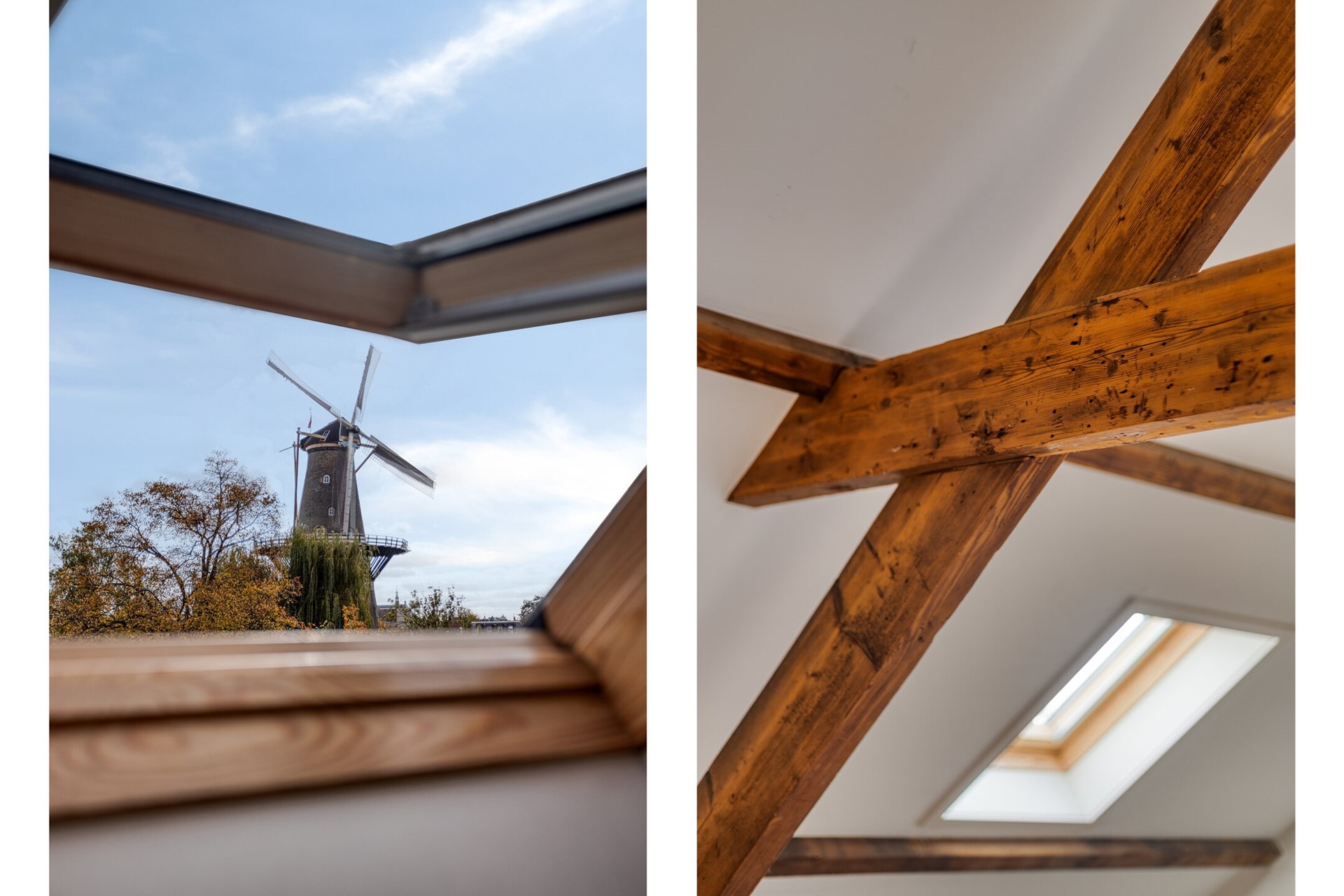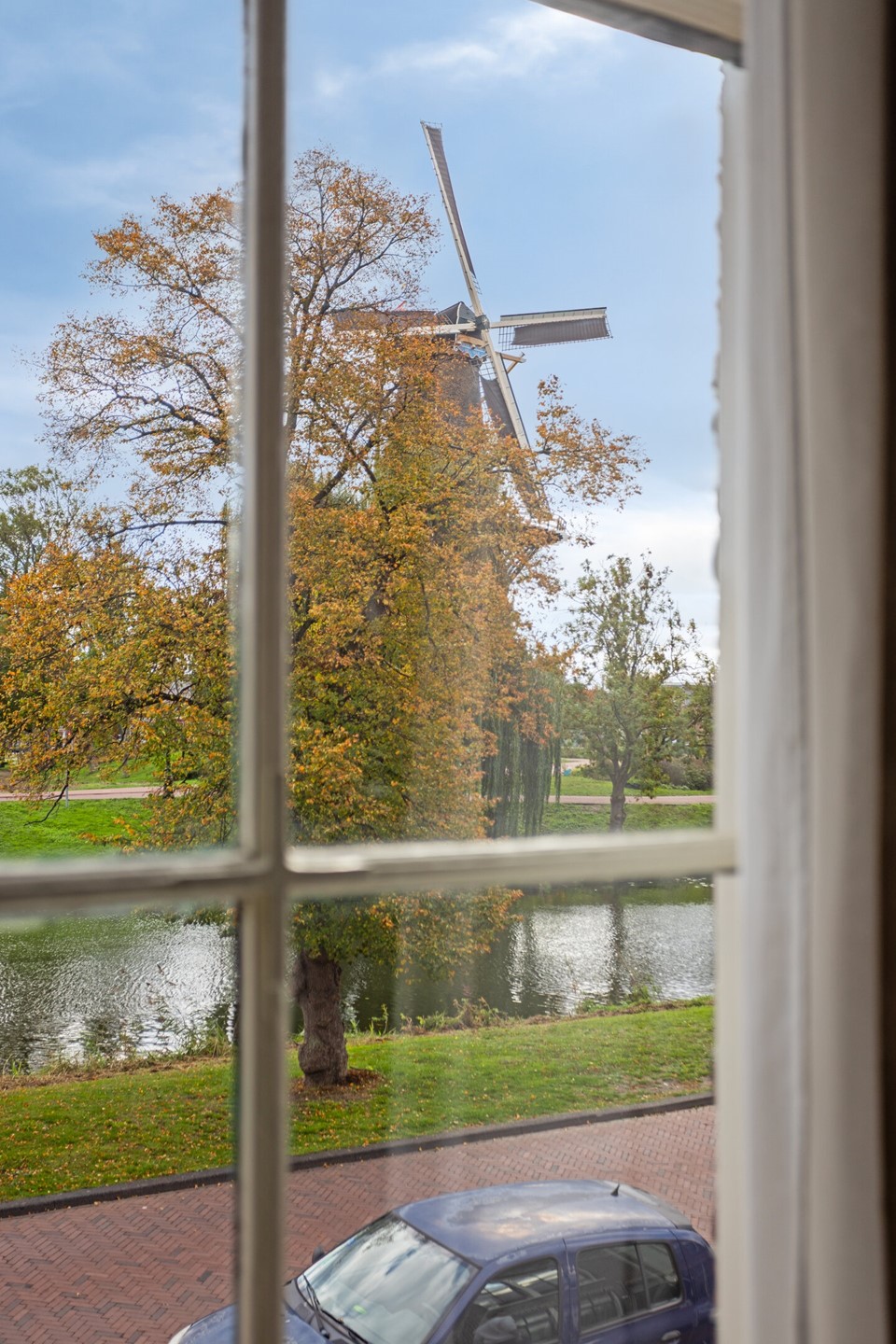 Overloop met de trap naar de 2e verdieping. Aan de achterzijde van deze unieke woning bevindt zich wederom een woonkeuken voorzien van een keukenblok met design afzuigkap en (inbouw) apparatuur. Extra opbergruimte vindt u in de trapkast. Via een doorloop bereikt u de badkamer met wastafel, toilet en een radiator. Het is tevens mogelijk om hier een doucheruimte te creëren. De L-vormige kamer aan de voorzijde van de woning maakt deze woning extra bezichtigingswaardig. Wat een geweldig uitzicht op o.a. de singel en molen De Valk heeft u vanuit deze kamer! Het is zeer aannemelijk dat u deze kamer zult gaan gebruiken als woonkamer.