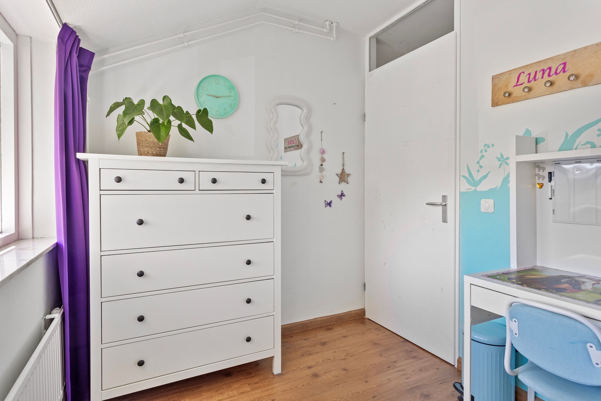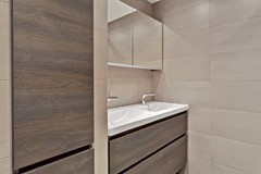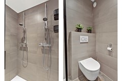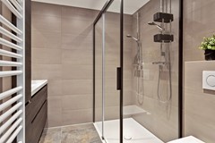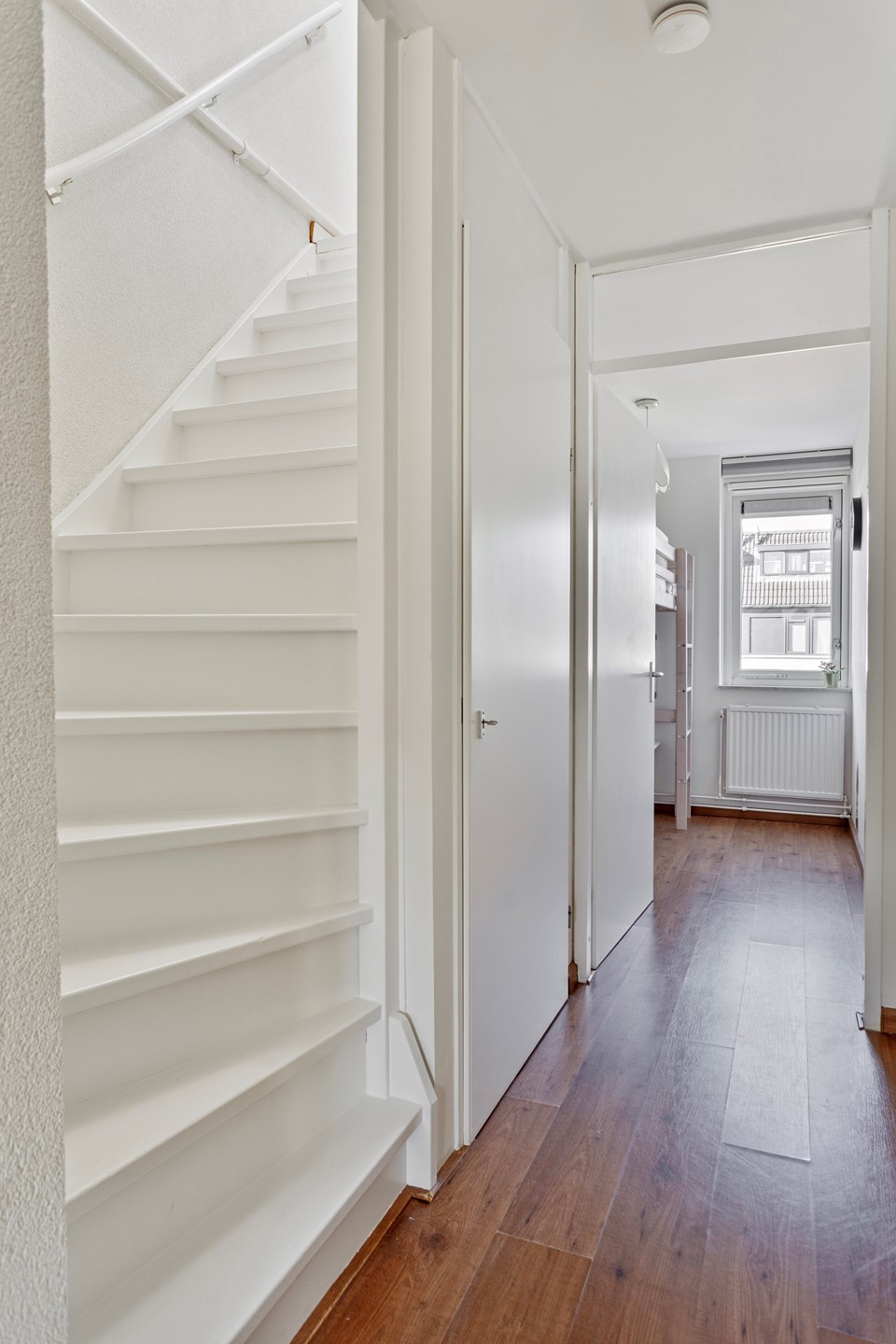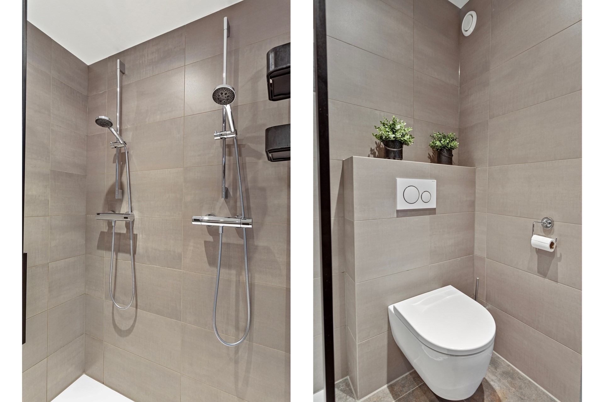 Overloop met vaste kast en de trap naar de 2e verdieping. Aan de achterzijde van de woning bevinden zich twee slaapkamers voorzien van elektrisch bedienbare rolluiken. Aan de voorzijde van de woning vindt u de derde slaapkamer. De moderne badkamer (2022) is voorzien van een dubbele wastafel, luxe dubbele douche, inbouwverlichting, designradiator en een 2e (hangend) toilet.