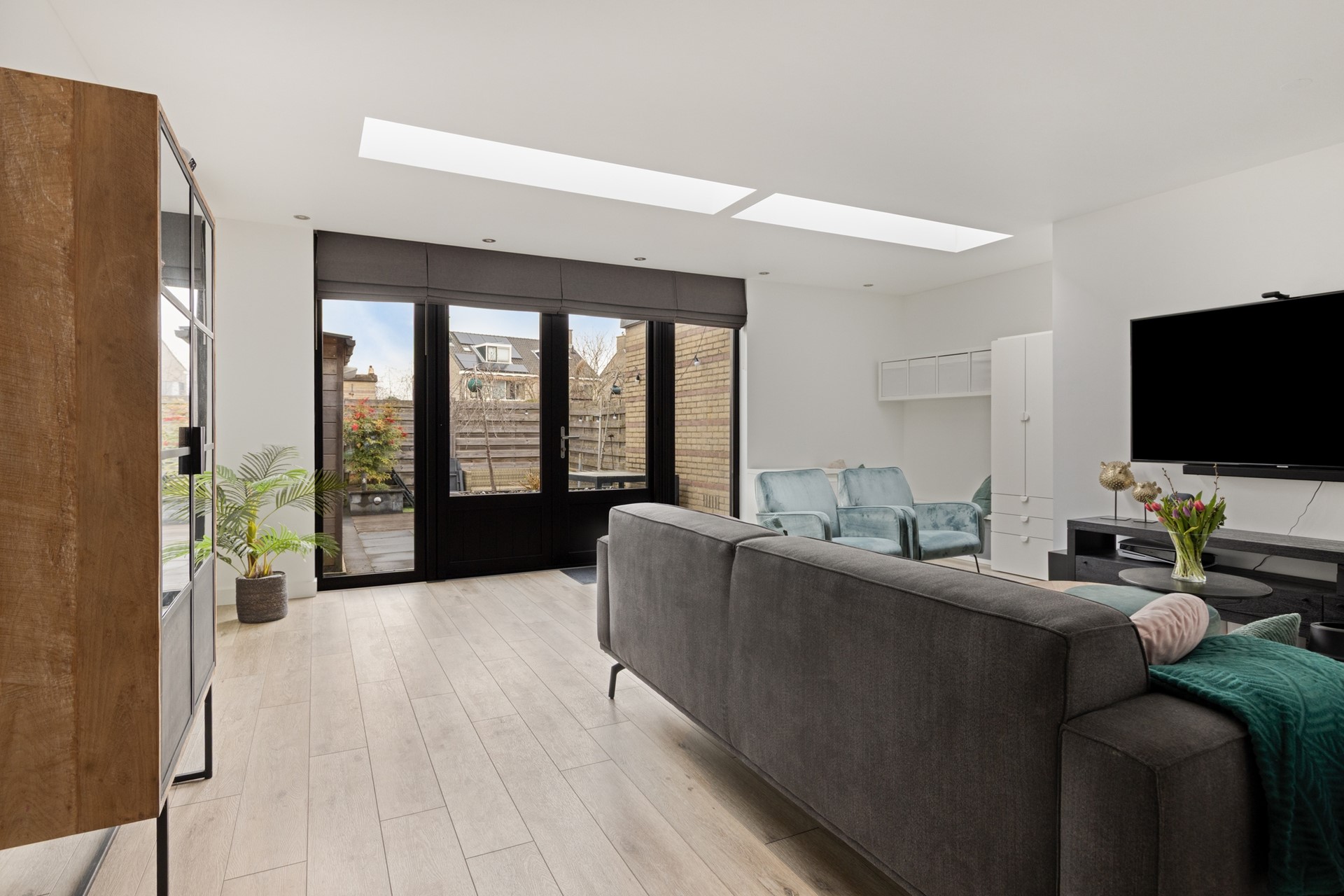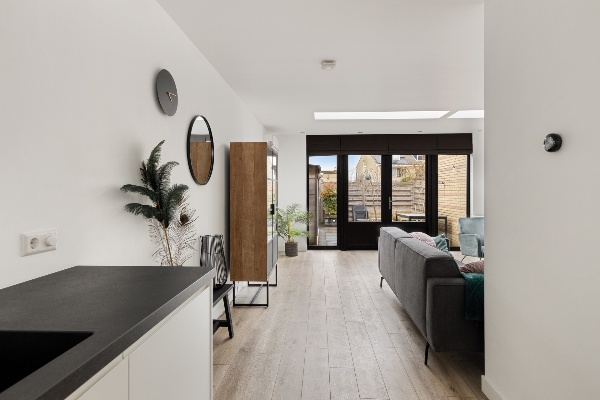 Voortuin (Z). Entree van de woning, hal met meterkast (2022) en een toiletruimte met hangend closet + fonteintje. Aan de voorzijde van de woning bevindt zich de royale keukenruimte. Er is genoeg ruimte voor een grote eettafel in deze gezellige woonkeuken. Beeldt u zich eens in hoe fijn deze plek in huis kan zijn wanneer u vrienden of familie hebt uitgenodigd voor een diner... De moderne keuken (2020) beschikt o.a. over een inductiekookplaat, rvs afzuigkap, twee combi ovens, koel/vriescombinatie, Quooker, vaatwasser en inbouwverlichting. De trapkast zorgt voor opbergruimte. Aan de achterzijde van de woning vindt u de uitgebouwde woonkamer. De lichtstraat zorgt voor extra natuurlijk daglicht in deze ruime woonkamer. De inbouwverlichting en airconditioning geven extra comfort. Door de grote raampartij geniet u van een optimaal uitzicht op de achtertuin. De hal, woonkamer en keukenruimte zijn afgewerkt met een onderhoudsvriendelijke pvc vloer inclusief vloerverwarming en de wanden en plafond zijn netjes gestuukt. Via de dubbele openslaande deuren in de woonkamer bereikt u de zonnige achtertuin (N) met houten berging en een achterom.
