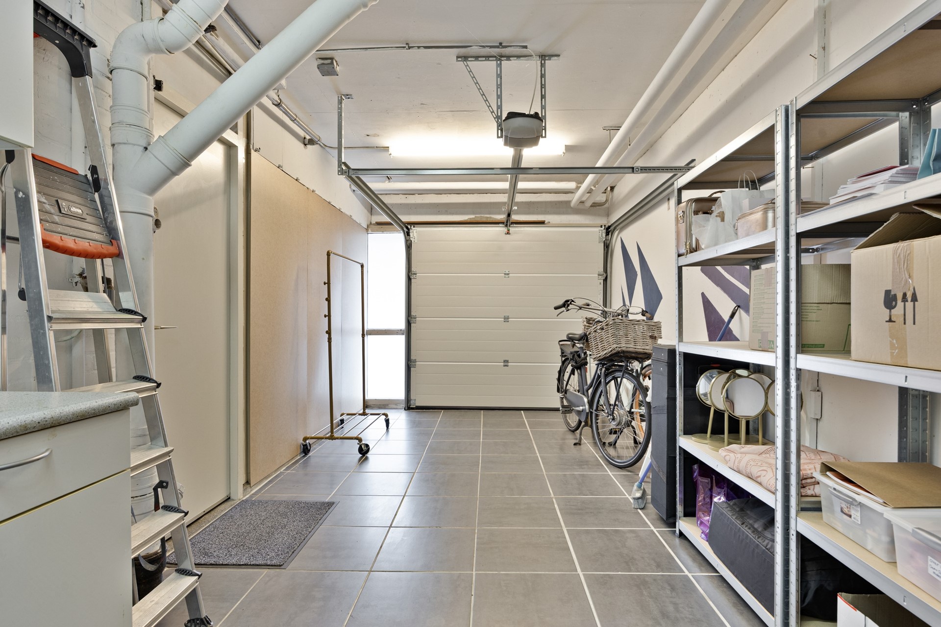 Begane grond: Entree, hal met meterkast en toegang tot de garage. De garage is voorzien van een wateraansluiting en een elektrische sectionaaldeur. Via de trapopgang met schuifdeur bereikt u de 1e verdieping.
