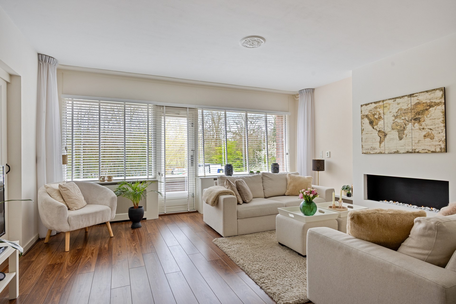 Overloop met intercom en moderne toiletruimte met hangend closet + fonteintje. en de trapopgang naar de slaapverdieping. Door de grote raampartij geniet u van een lichte woonkamer met decoratieve bio-ethanol haard met schouw en toegang tot een balkon. Vanuit dit balkon en de woonkamer geniet u aantrekkelijk uitzicht op park De Houtkamp. Aan de achterzijde van de woning bevindt zich de ruime keukenruimte. Er is genoeg ruimte voor een grote eettafel in deze gezellige woonkeuken. Beeldt u zich eens in hoe fijn deze plek in huis kan zijn wanneer u vrienden of familie hebt uitgenodigd voor een diner... De moderne keuken beschikt o.a. over een granieten werkblad, 5-pitskookplaat, rvs afzuigkap, apothekerskast, combi oven, koel/vriescombinatie en een vaatwasser. Via de woonkamer bereikt u een slaapkamer welke ook uitermate geschikt is als studie-, hobby- en/of kinderkamer. Tussenhal met toegang tot de badkamer. Deze opvallend ruime badkamer (oorspronkelijk slaapkamer) met ligbad, separate douche en wastafelmeubel met kranen maakt deze woning extra bezichtigingswaardig. U zult hier een wellness ervaring beleven. De oorspronkelijke badkamer is nu in gebruik als wasruimte met opstelplaats voor de boiler (eigendom/80L./2021). De overige twee slaapkamers met beide toegang tot een balkon maken het geheel compleet.