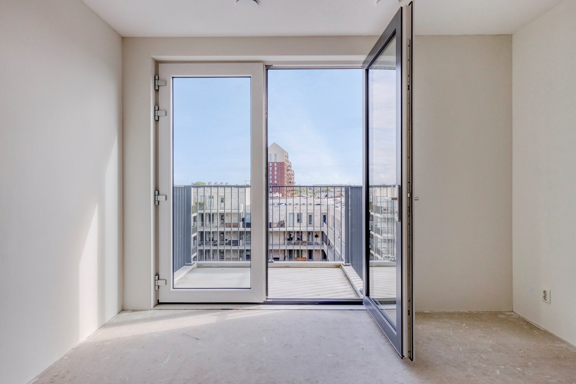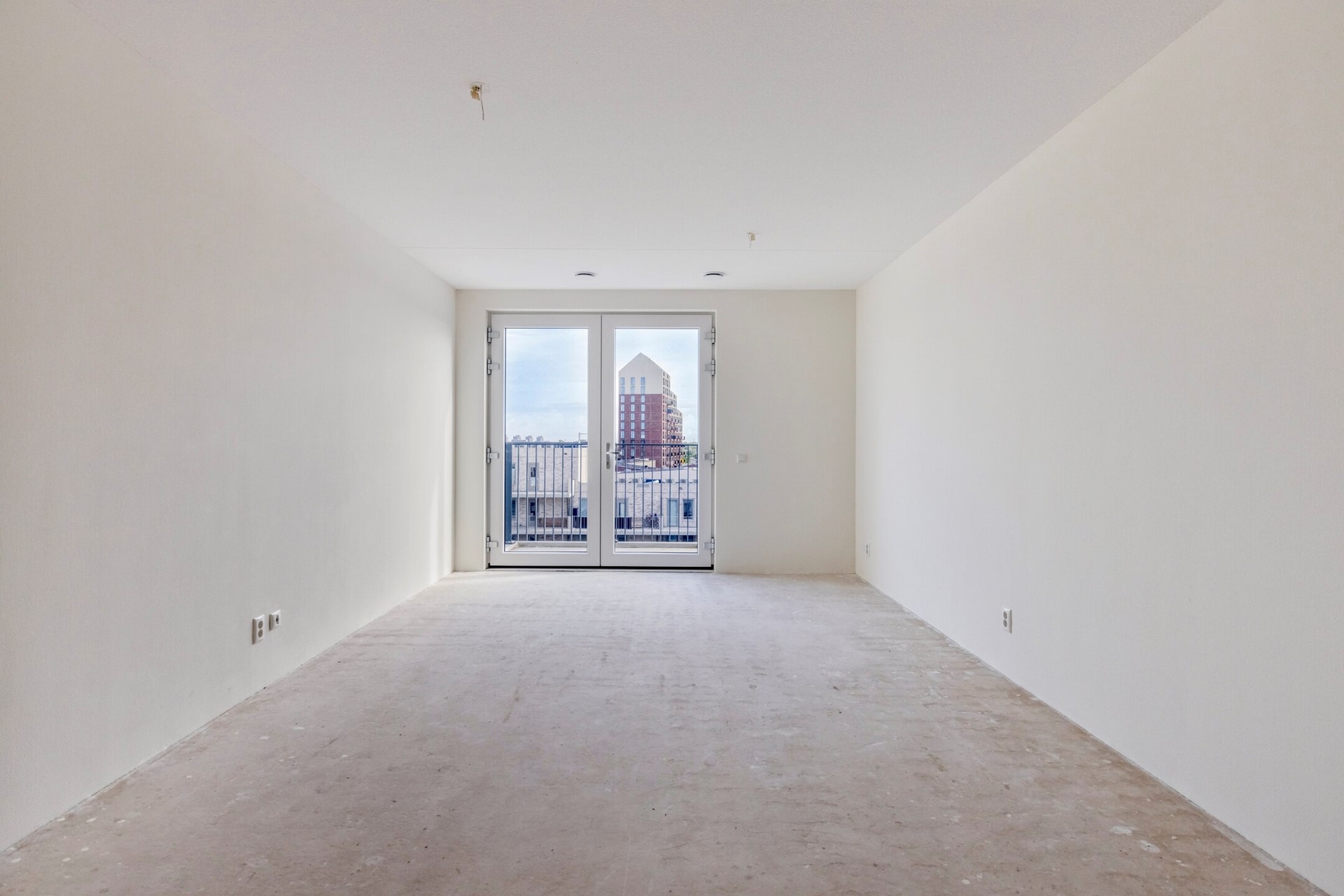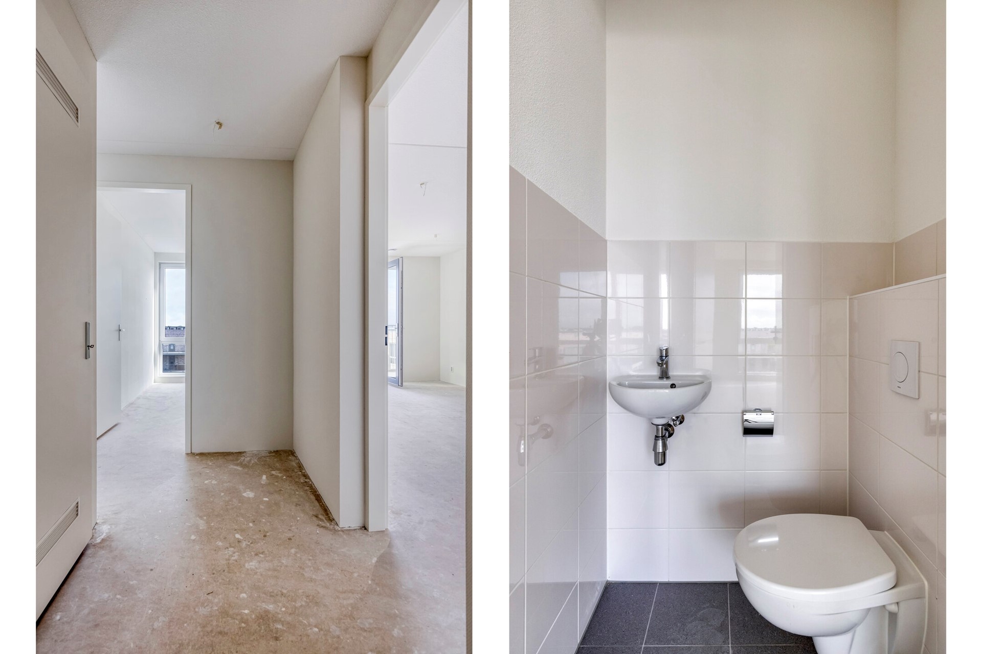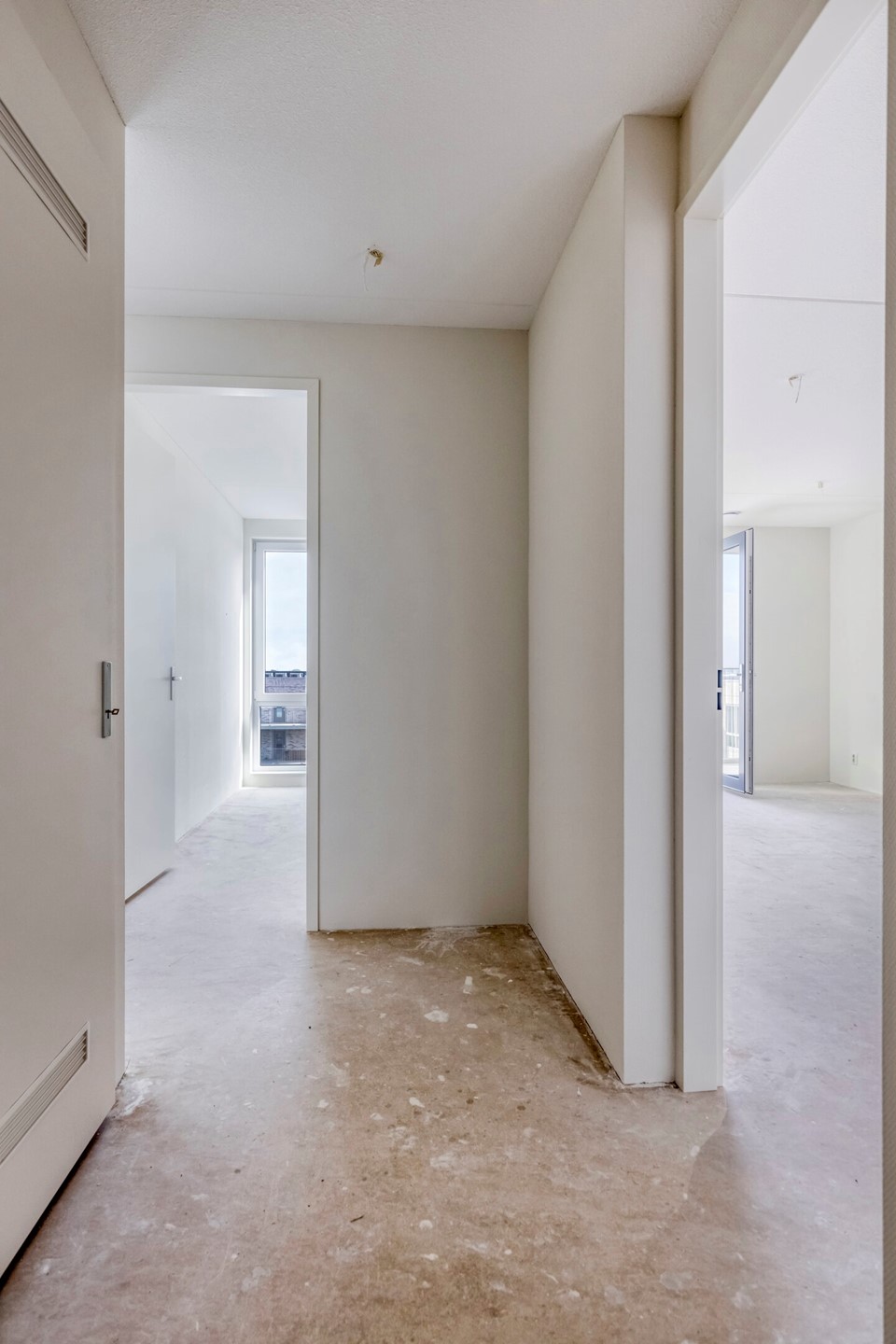 Entree woning. Gang met videofooninstallatie, meterkast en een moderne toiletruimte met hangend closet + fonteintje. Separate (berg)ruimte met warmtepompsysteem (lucht-water), wasmachineaansluiting en de opstelplaats voor de warmte terugwin installatie. De geheel betegelde badkamer is voorzien van een inloopdouche, wastafel en een designradiator (elektrisch). De twee slaapkamers bevinden zich aan de achterzijde van de woning. De verdiepingshoge raampartij van de dubbele openslaande deuren zorgen voor een lichte woonkamer. De moderne open keuken beschikt o.a. over een inductiekookplaat, afzuigkap, combi magnetron, koel/vriescombinatie en een vaatwasser. De wanden zijn netjes afgewerkt. De betonvloer van de gang, woonkamer, keukenruimte en de slaapkamers zijn nog niet afgewerkt. Dé kans om uw eigen wensen te realiseren! Vanuit de woonkamer, beide slaapkamers en het balkon heeft u uitzicht op o.a. de binnentuin.